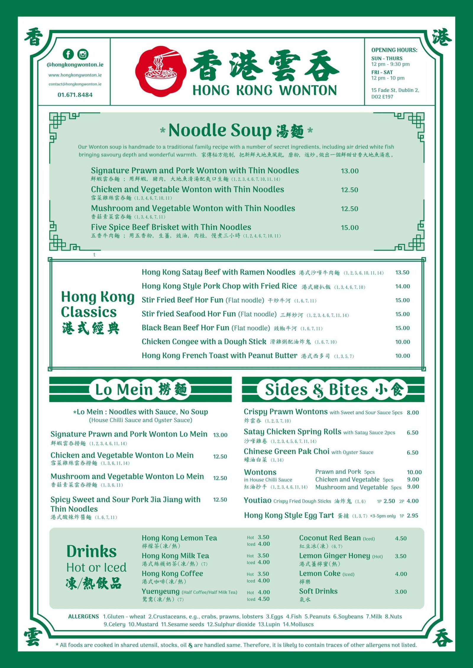 At HK Wonton, every dish is a journey to the bustling streets of Hong Kong, where food is more than just a meal—it’s a way of life. Whether you’re in the mood for a quick bite, a hearty meal, or a refreshing drink, our menu offers something for everyone. Come and experience the vibrant flavors and comforting warmth of Hong Kong cuisine, right here in Dublin.